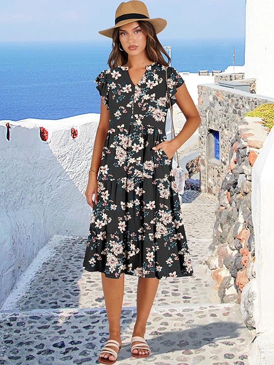 - Features - Adorned with charming ruffled sleeves, V neck, pleated, solid color, and floral printed tiered boho midi dress, this summer dress is a perfect choice for daily wear, school, work, office, party, casual outings, beach, travel.